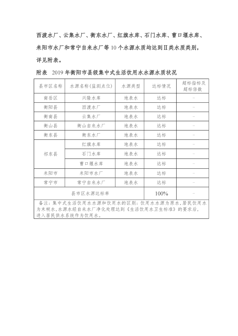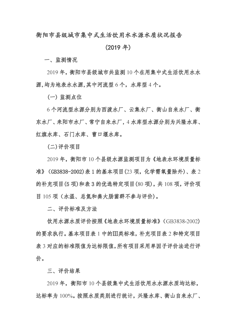 衡陽(yáng)市縣級(jí)城市集中式生活飲用水水源水質(zhì)狀況報(bào)告(2019年)