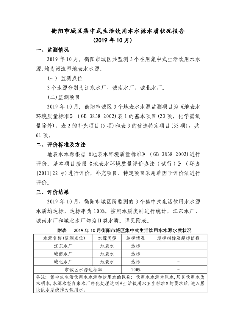 衡陽市城區(qū)集中式生活飲用水水源水質(zhì)狀況報(bào)告(2019年10月)